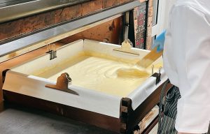 アカシヤはちみつを配合した生地はデリケートで、通常のカステラ生地よりも火加減の